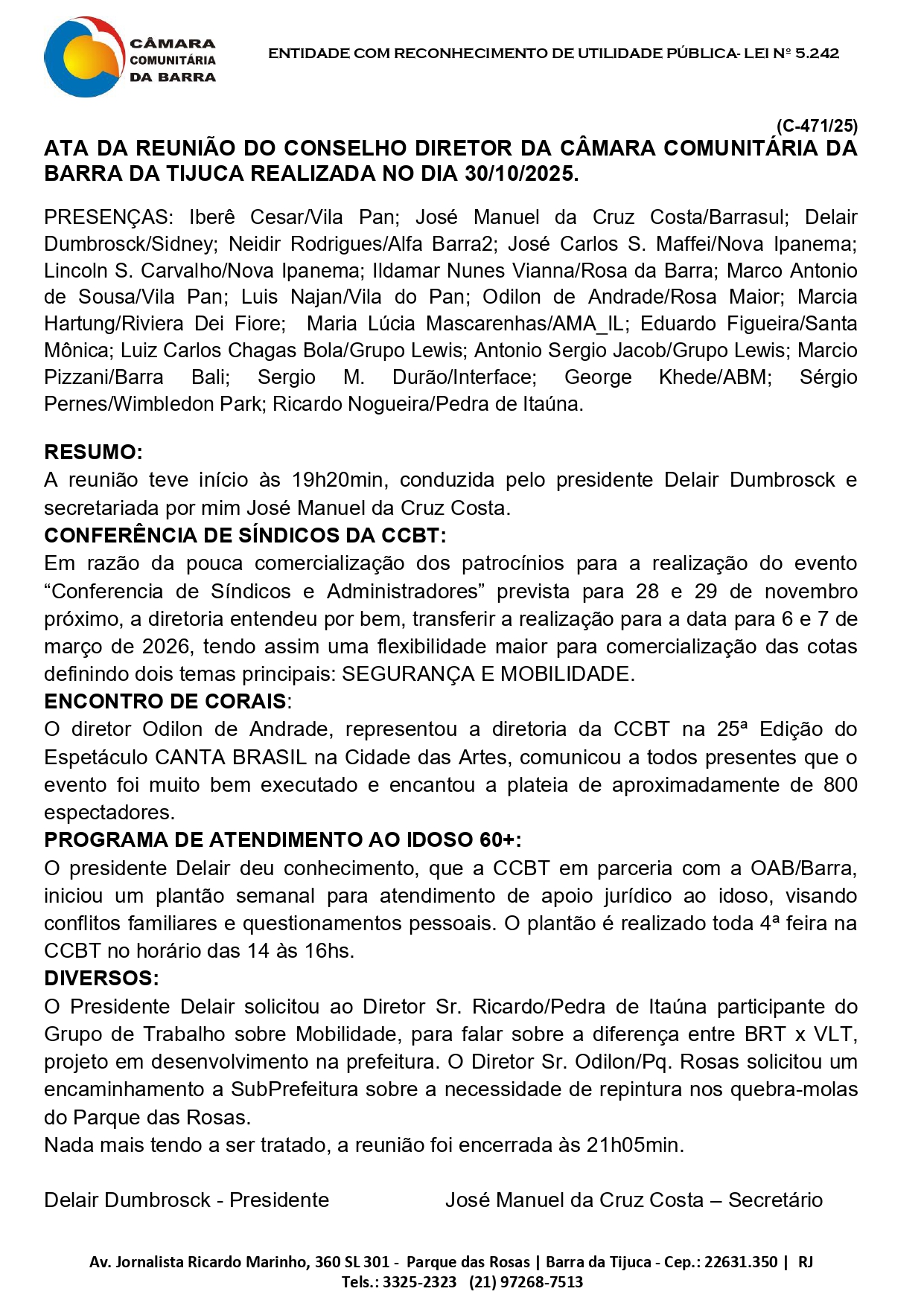 (C-471/25) ATA DA REUNIÃO DO CONSELHO DIRETOR DA CÂMARA COMUNITÁRIA DA BARRA DA TIJUCA REALIZADA NO DIA 30/10/2025.