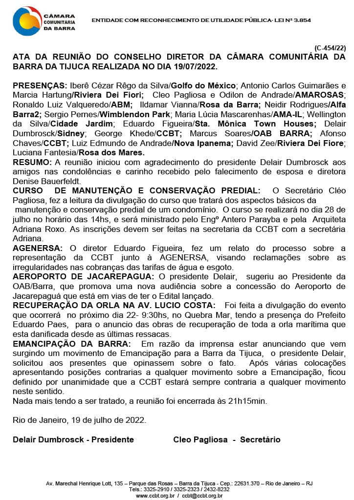 CCBT – ATA C-454 REUNIÃO CONSELHO DIRETOR DA CÂMARA COMUNITÁRIA DA BARRA DA TIJUCA REALIZADA NO DIA 19/07/2022