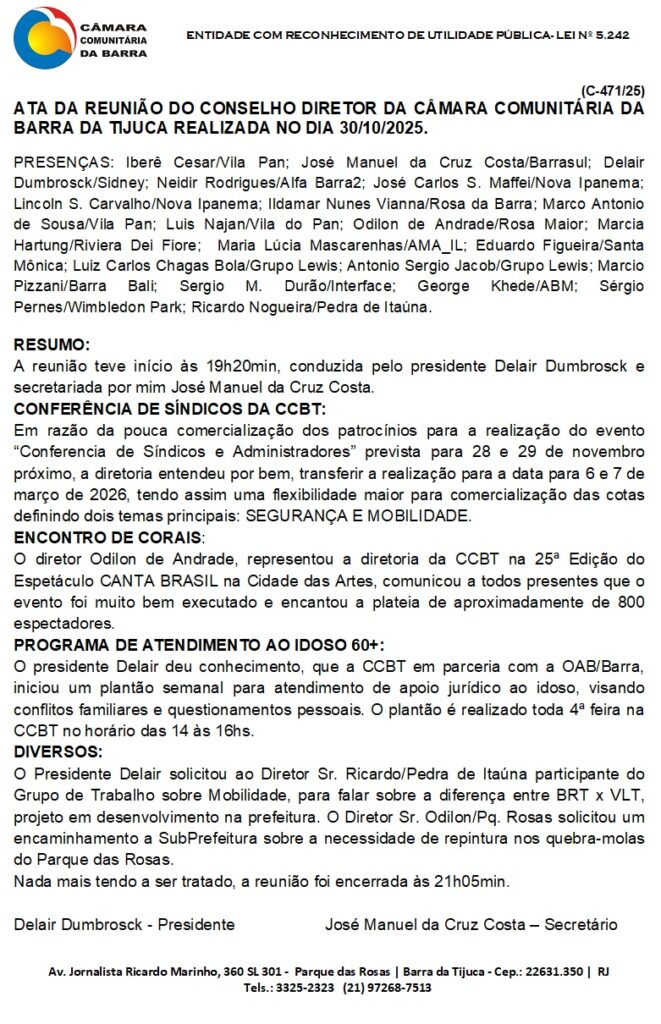 ATA C-471/25- ATA DA REUNIÃO DO CONSELHO DIRETOR DA CÂMARA COMUNITÁRIA DA BARRA DA TIJUCA REALIZADA 30/10/2025.